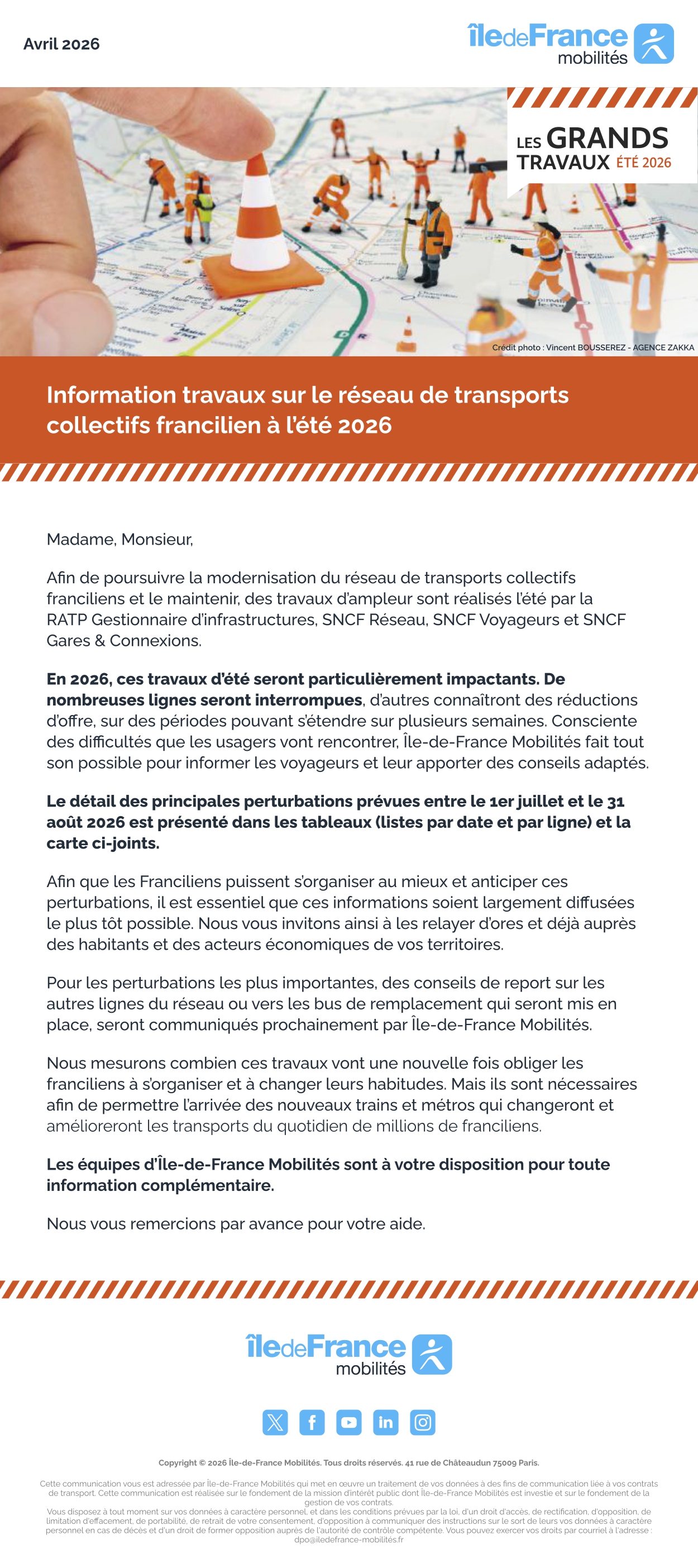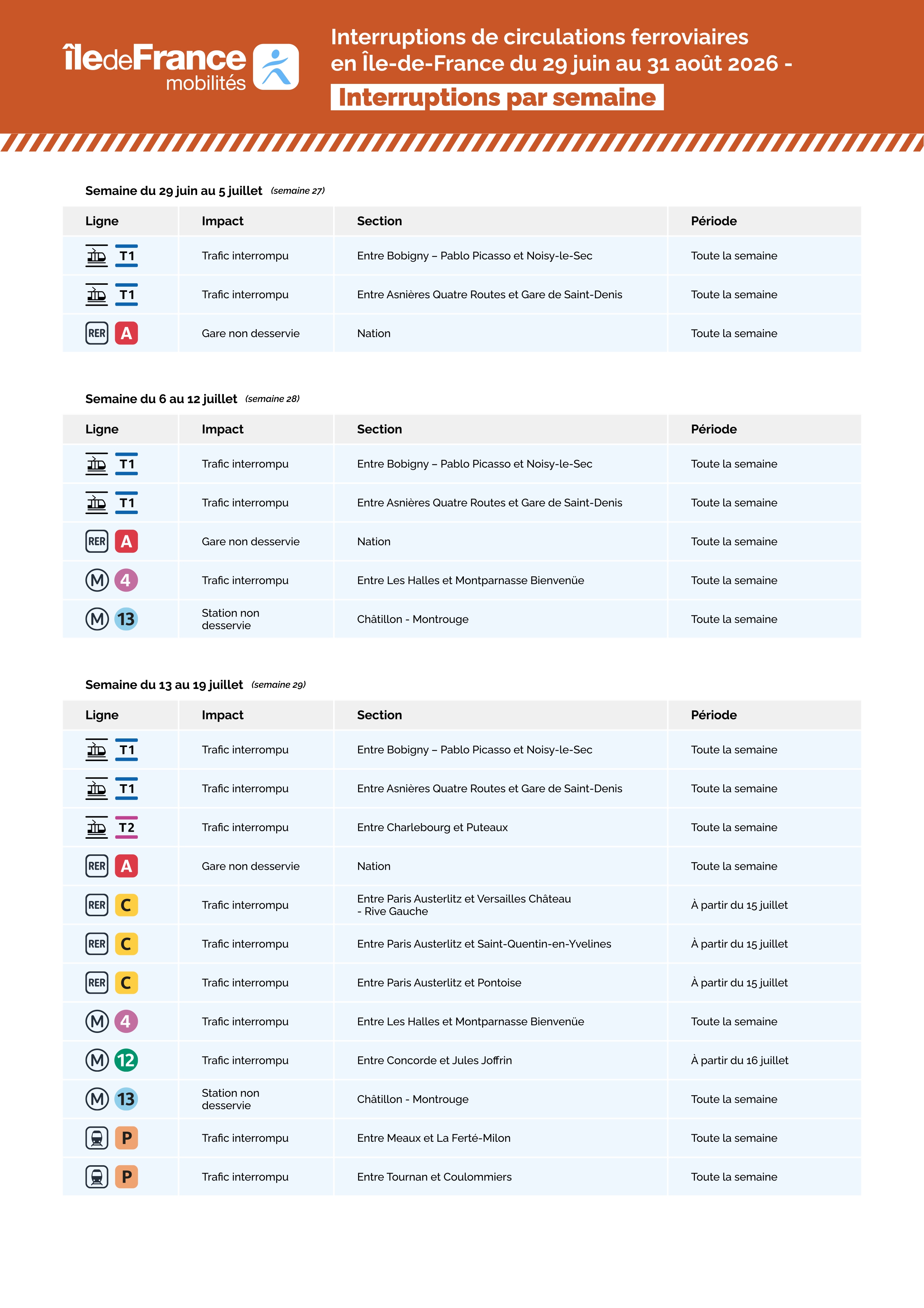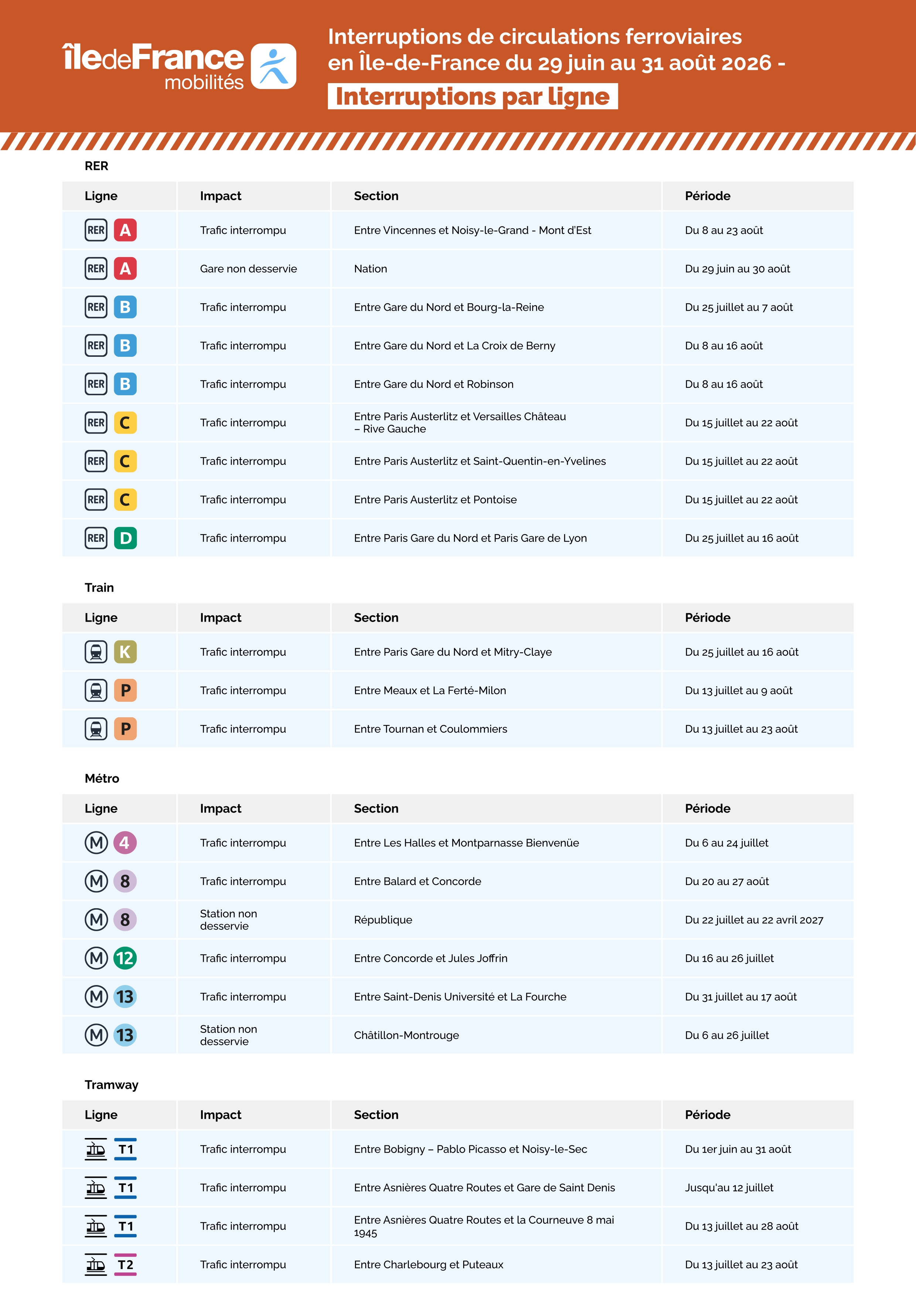 Ile de France Mobilités nous informe de travaux de modernisation d'envergure qui impacteront fortement le réseau de transports francilien entre le 1er juillet et le 31 août 2026.