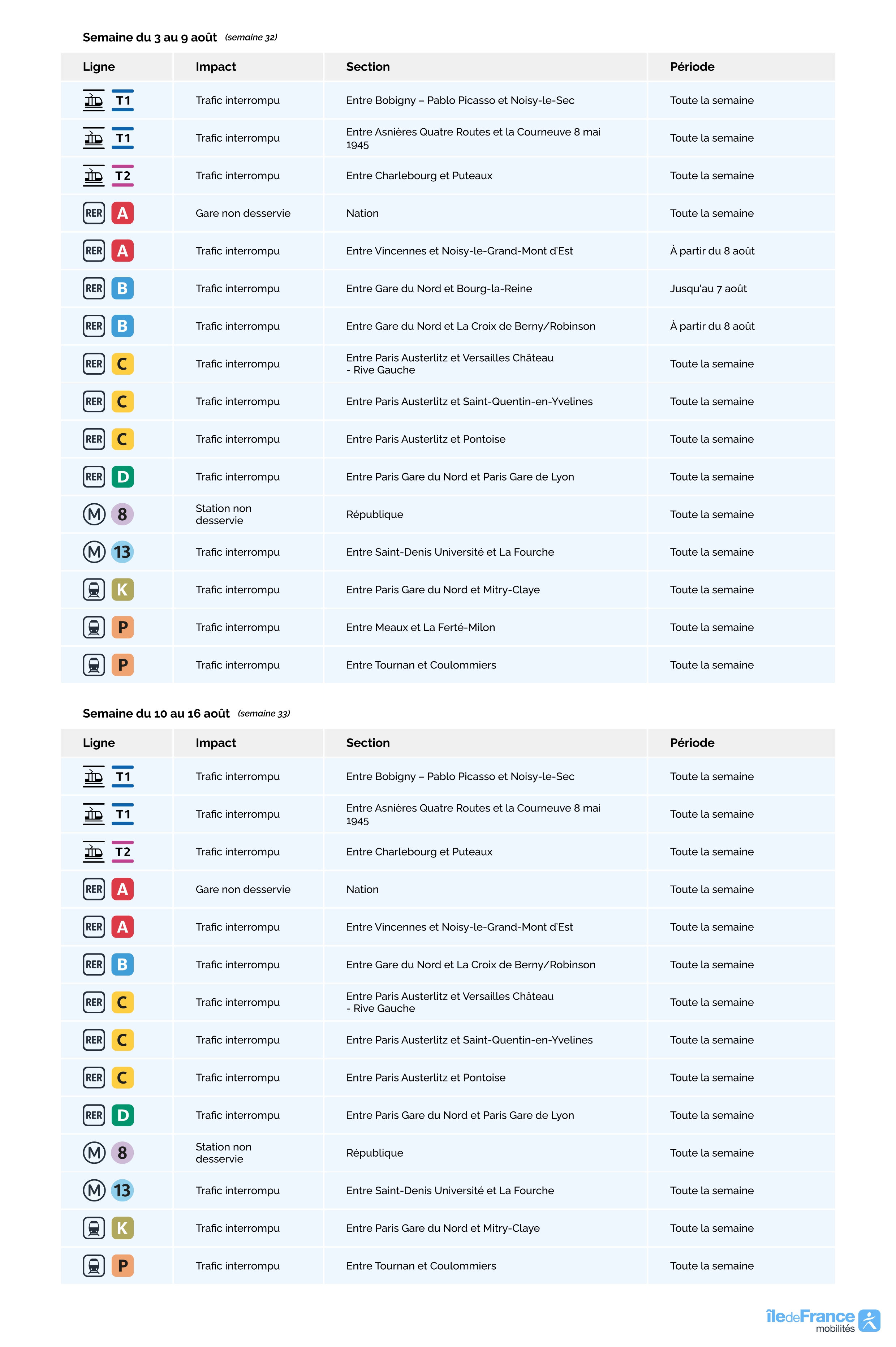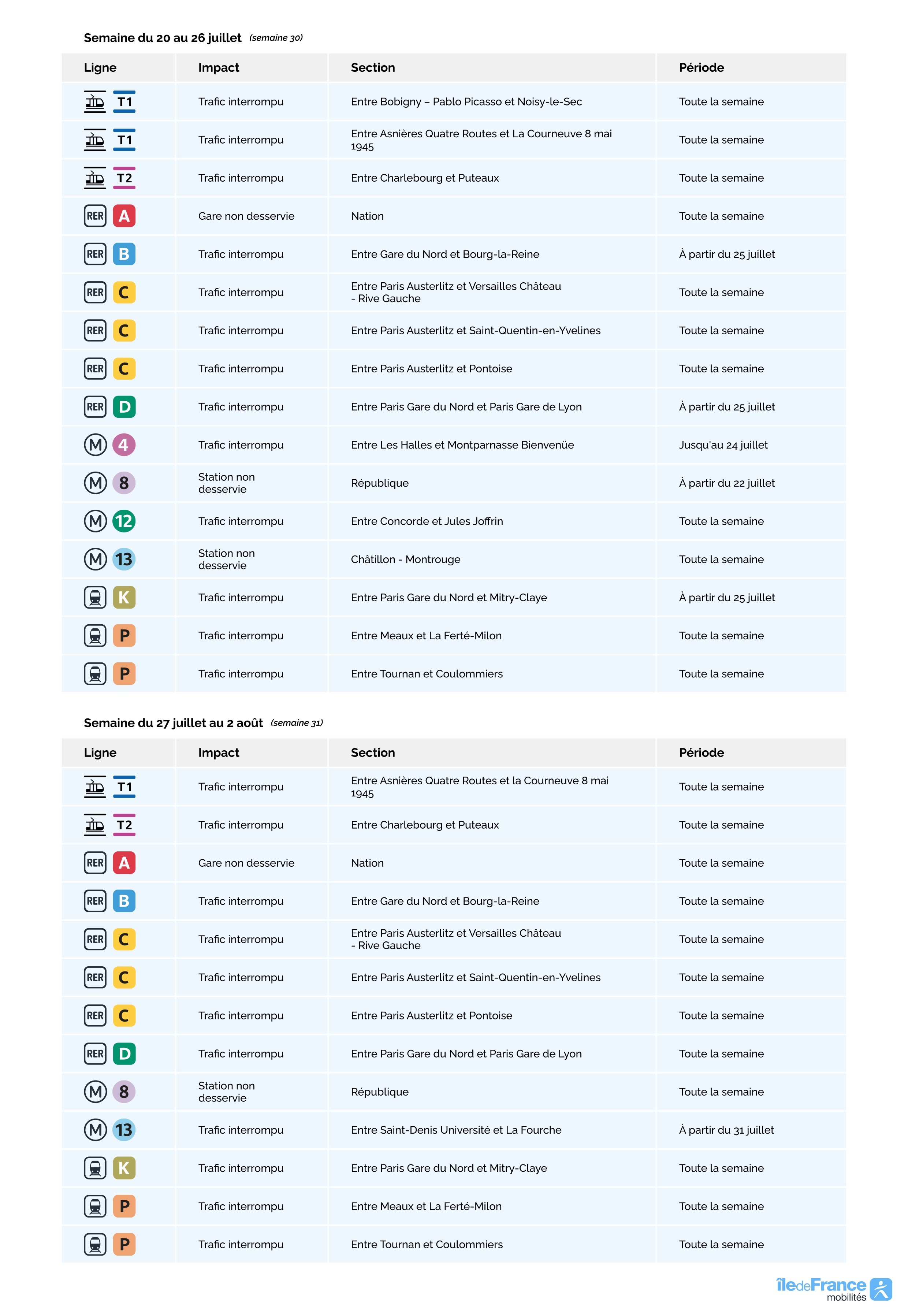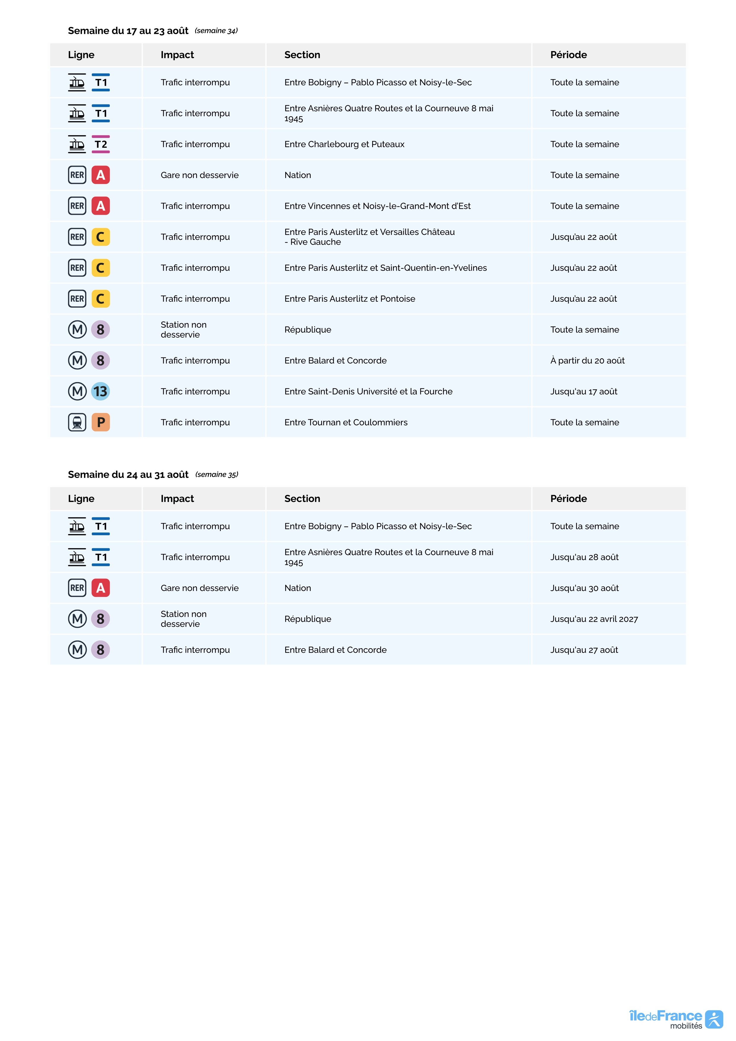 - Perturbations : interruptions de lignes et réductions d'offre sur plusieurs semaines.