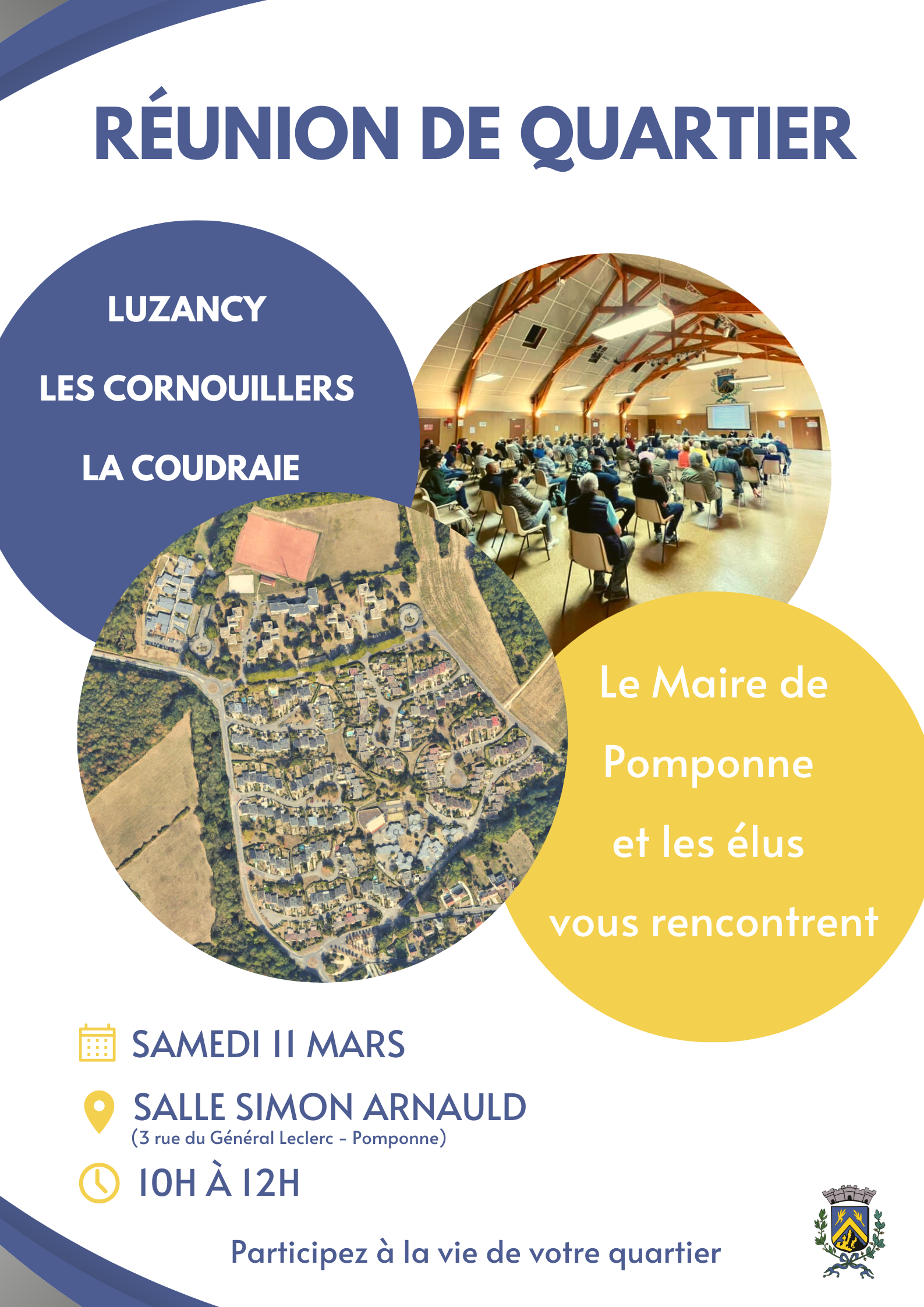 Arnaud BRUNET, Maire de Pomponne et son équipe vous invitent à une Réunion de Quartier. Véritable temps d'échange entre habitants et élus, ces réunions ont pour objectifs d'écouter les Pomponnais sur des sujets qui les concernent et de les associer aux projets de la ville et aux réflexions en cours.