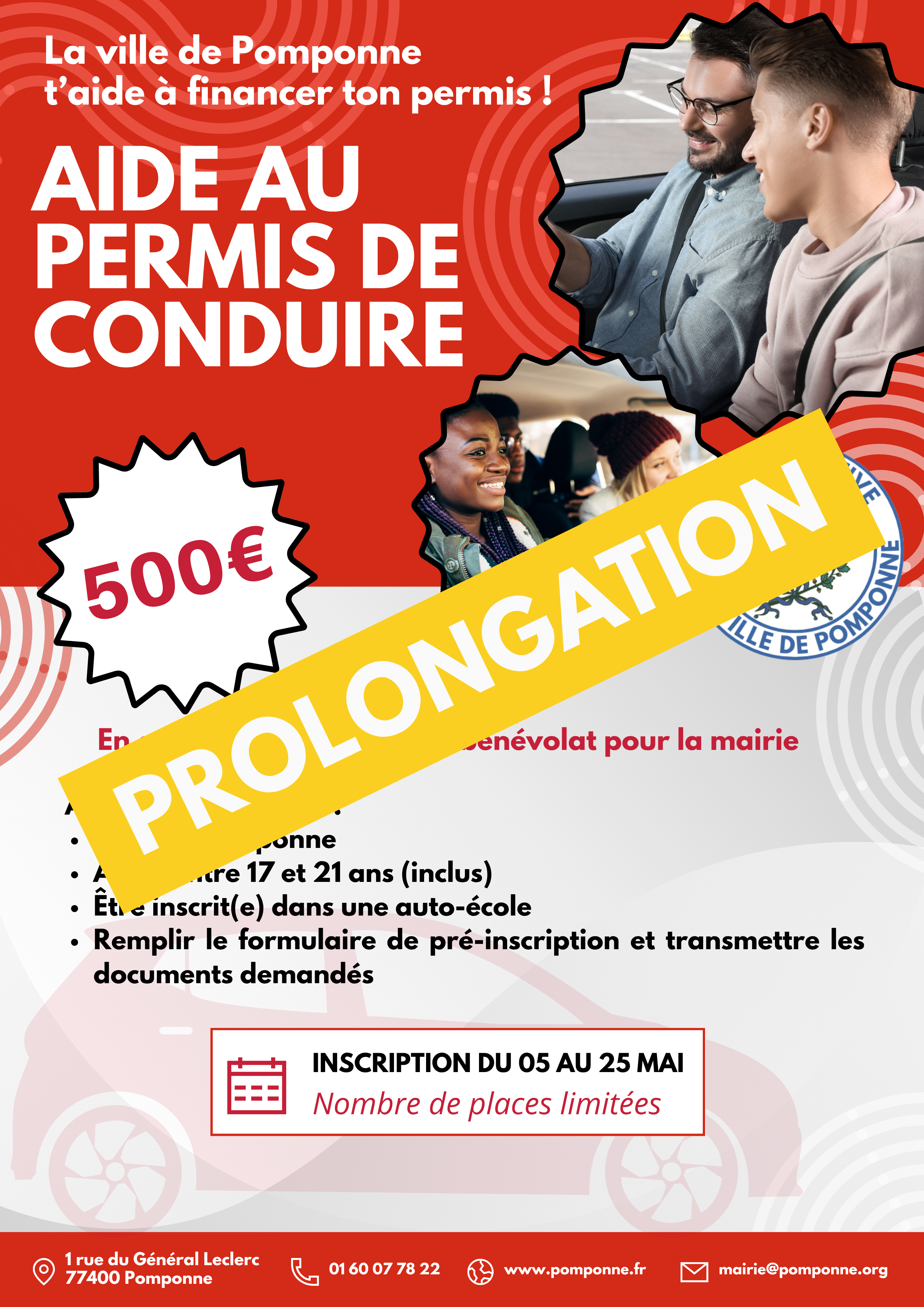 À partir d'aujourd'hui et jusqu'au 04 juin vous pouvez déposer votre candidature pour l'aide au permis de conduire auprès de la ville de Pomponne.