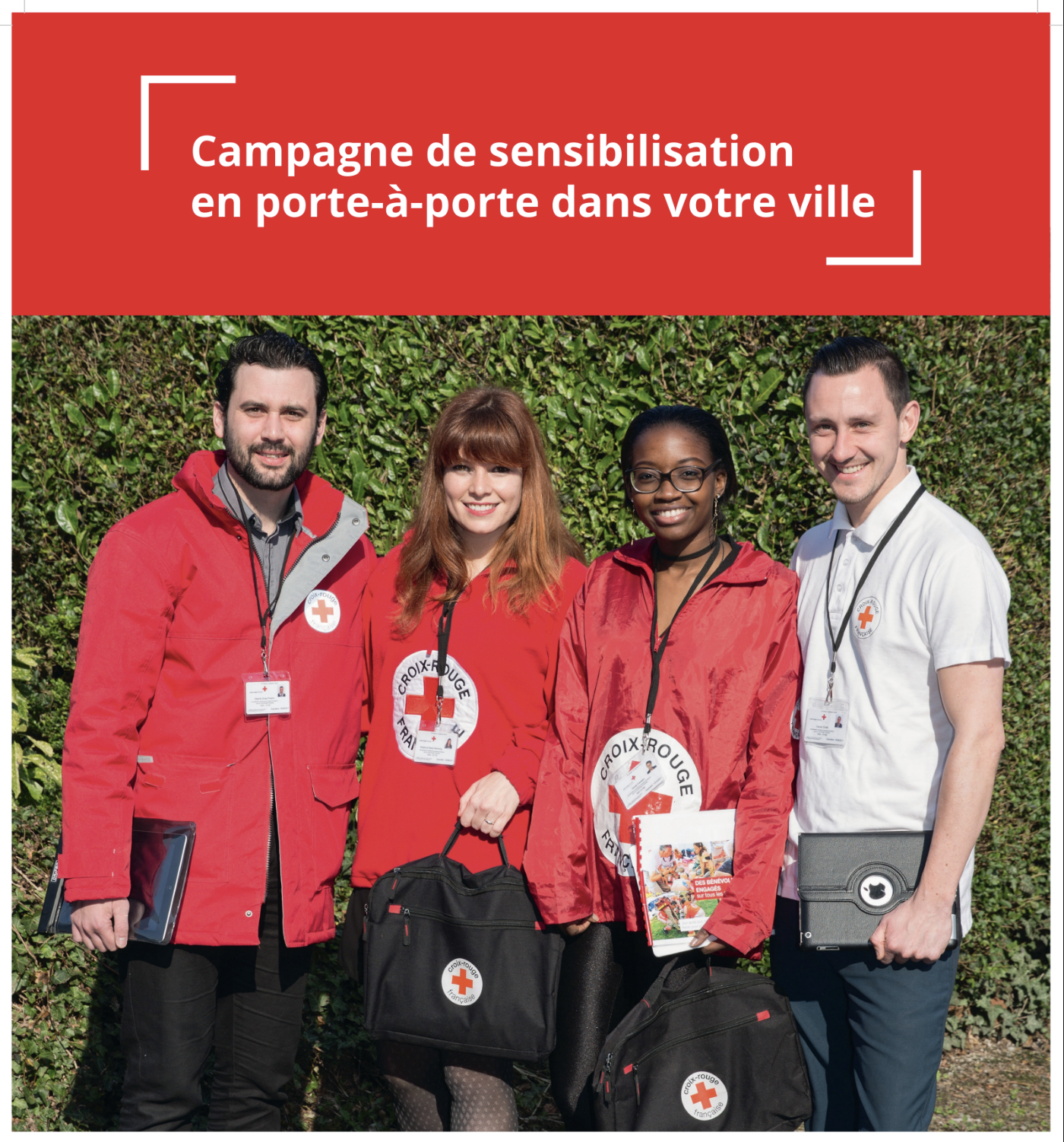 À travers la collecte de fonds en porte à porte, la Croix-Rouge française assure la pérennisation de ses actions partout en France. Ces ambassadeurs se rendent au domicile des particuliers sur l’ensemble des territoires pour leur proposer de soutenir les actions en devenant donateurs réguliers (par prélèvement automatique mensuel).